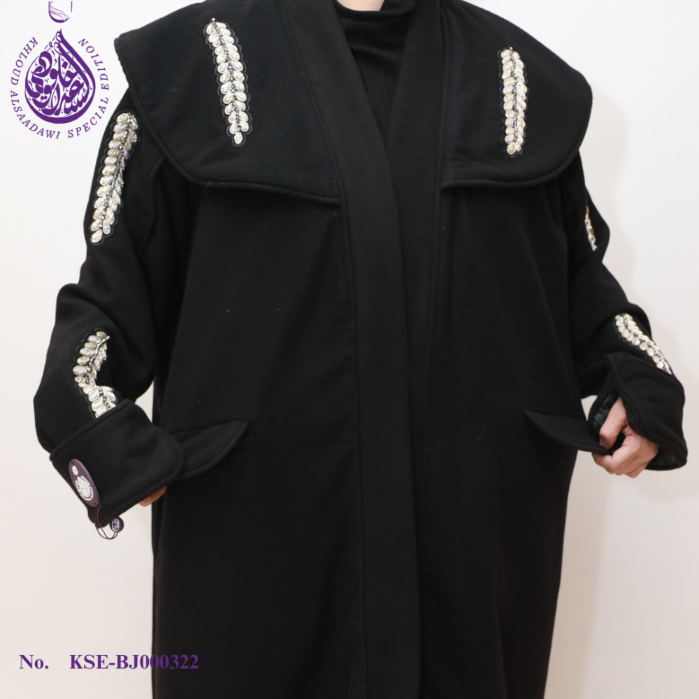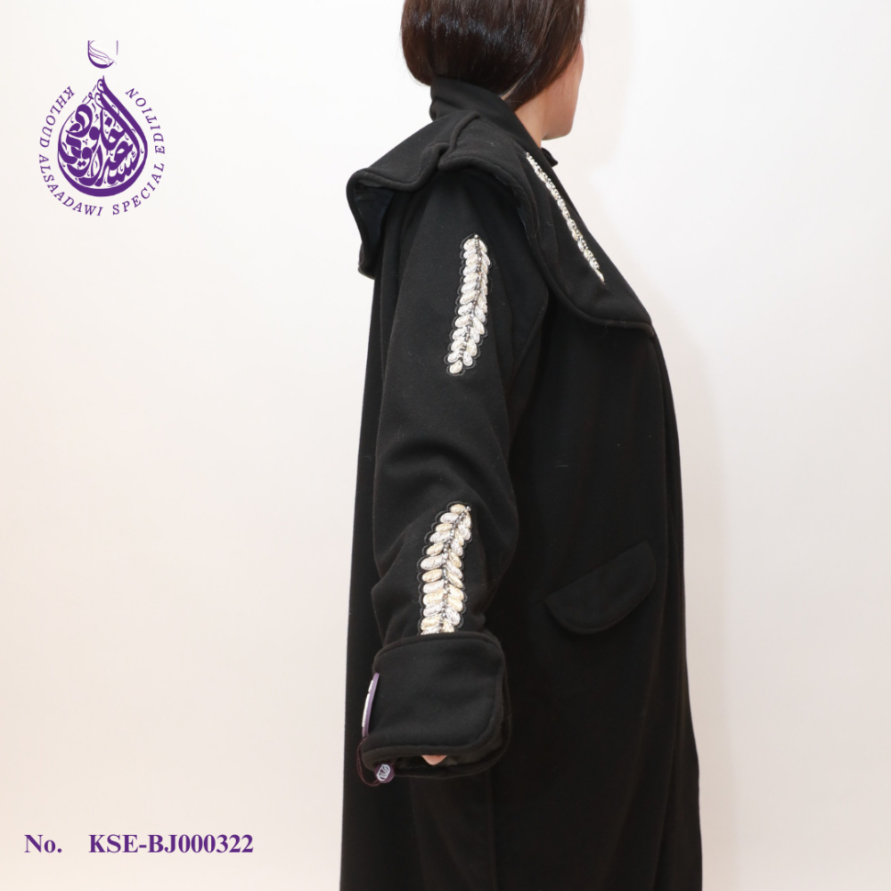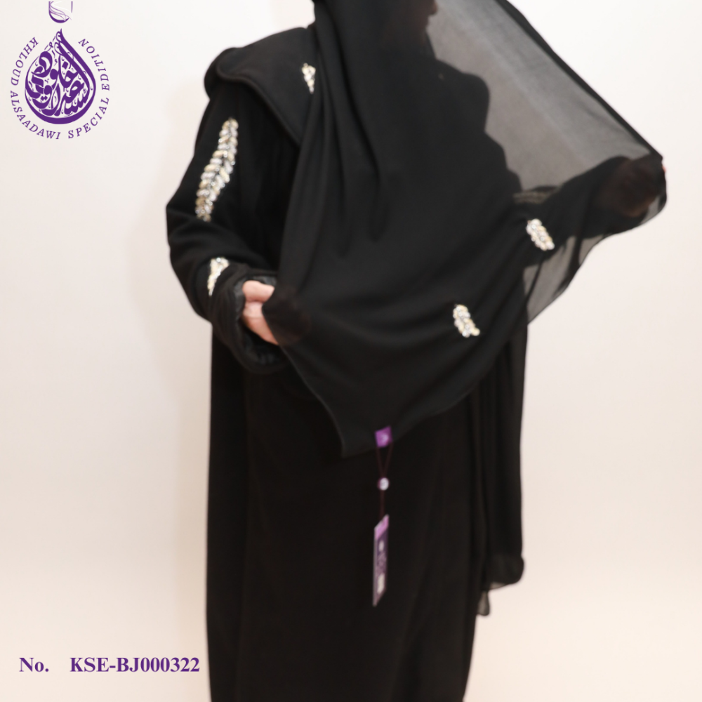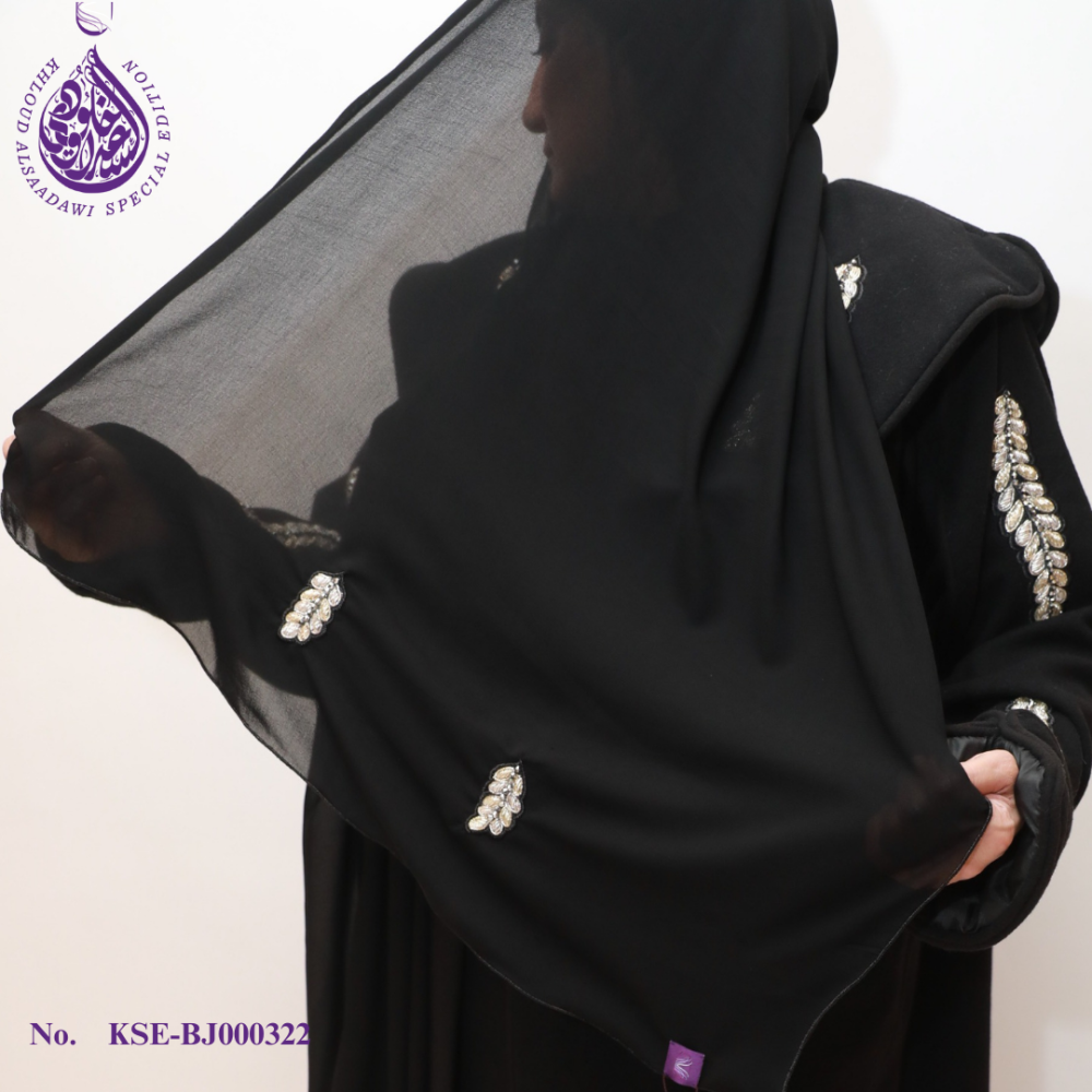 لإكمال المجموعة، تم تزيين الحجاب المطابق بتطريز القصب الأسود، مما يضمن مظهرًا متماسكًا وأنيقًا.