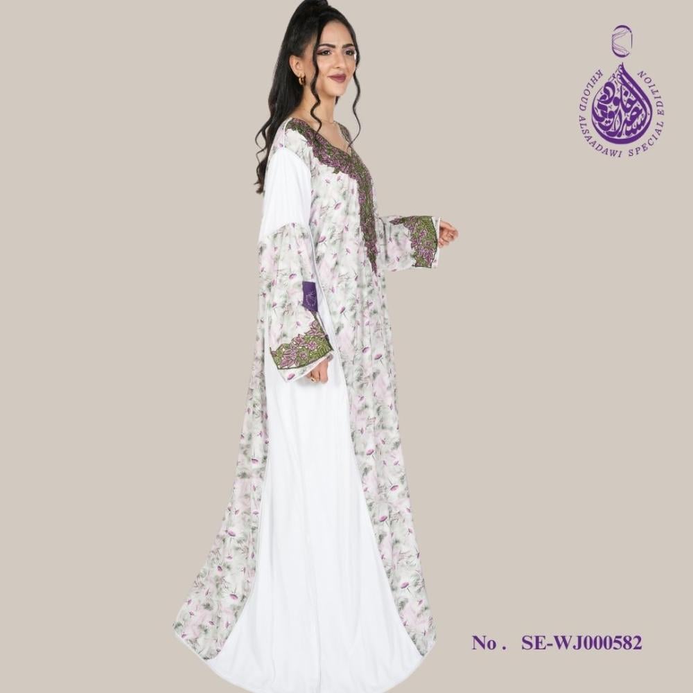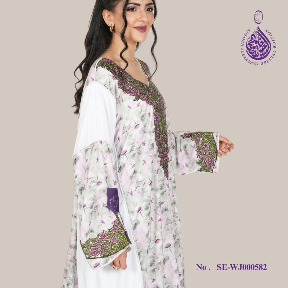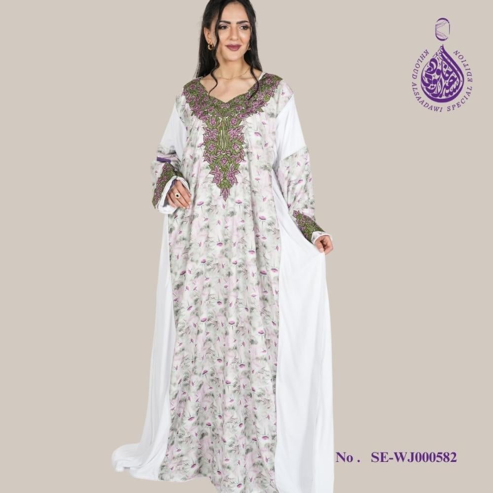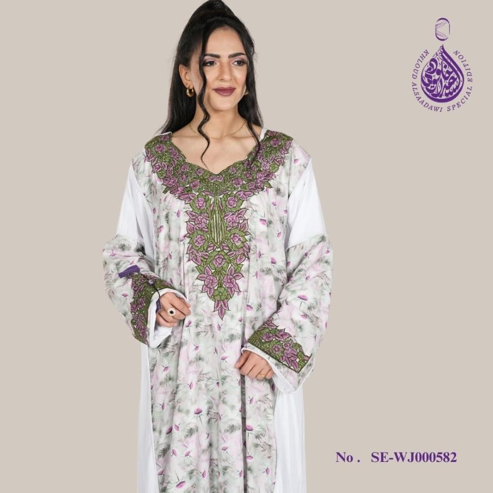 التصميم: تتميز هذه الجلابية الأنيقة بتصميم كلاسيكي. تطريز متقن باللون الأخضر على الجهة الأمامية والأكمام، مما يضمن مظهرًا متناسقًا وأنيقًا.